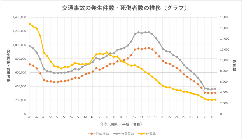交通規則・道路整備等でピークから大きく減少傾向になっていたが直近でいうとやや右肩に上がっている。