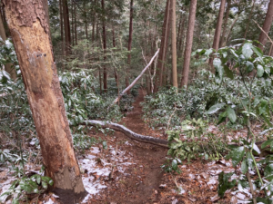 今回は、高尾山正面ではなく裏側から攻めるので駅から1時間ほど歩く。